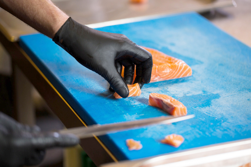 像Tronex 9388系列这样的黑色丁腈手套在餐饮业中越来越受欢迎。特别是在开放式厨房,厨师在顾客眼前呈现烹饪艺术时,浅色手套会沾染上血渍及食材的颜色,会影响烹饪的美感,黑色丁腈手套则不会有这样的尴尬。另外,黑色可突出食材本身的美丽,彰显厨师的尊贵气质。